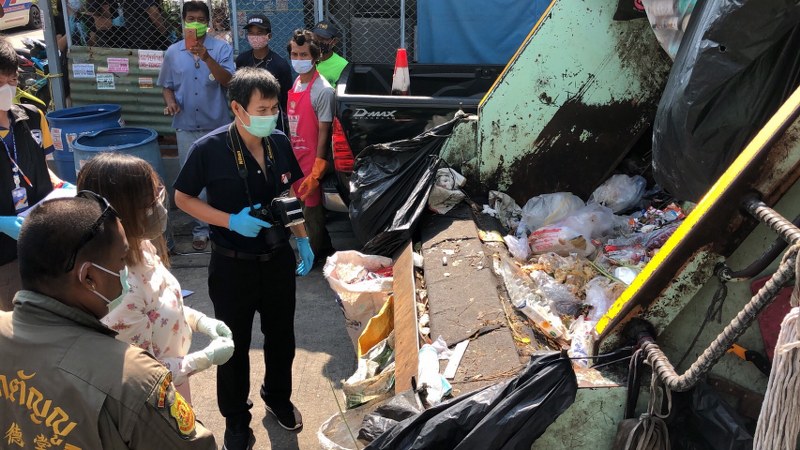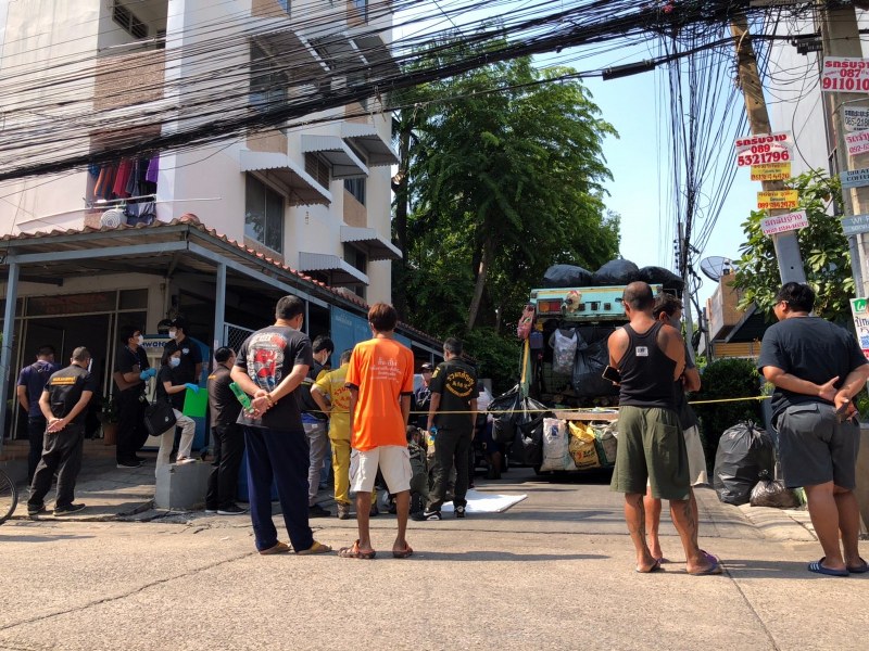 ที่เกิดเหตุพบรถขยะและพนักงานยืนรอเจ้าหน้าที่อยู่บริเวณข้างแมนชั่น ภายในรถขยะพบศพทารกเพศชายสวมใส่ชุดสีส้ม ใส่ผ้าอ้อมสําเร็จรูป (แพมเพิส)มีผ้าขนหนูสีฟ้าห่อหุ้มตัวไว้ โดยร่างของเด็กทารกถูกใส่อยู่ในถุงหิ้วสีฟ้าลายการ์ตูน อีกทั้งยังพบเอกสารต่างๆอยู่ในถุงอีกด้วย