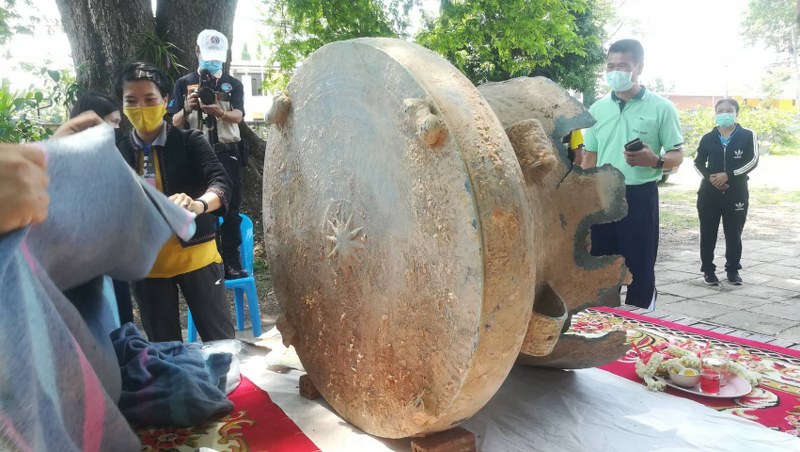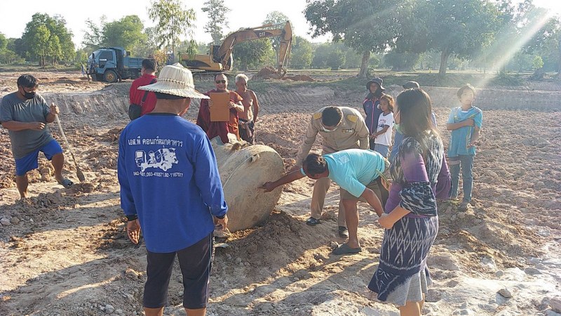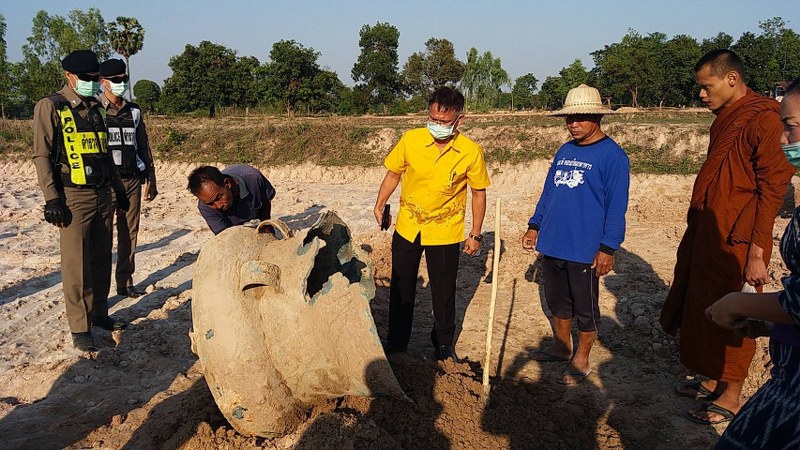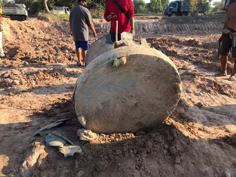 มุกดาหาร ชาวบ้านให้บริษัทสร้างถนนมาขุดบ่อดินที่ไม่ได้สร้างประโยชน์เพื่อนำดินไปถมถนนทางเข้าหมู่บ้านขณะที่คนขับรถแบคโฮกำลังขุดดินถูกวัตถุที่มีความแข็งอยู่ใต้ดินจึงพยายามตักขึ้นมา แล้วลงไปตรวจสอบเห็นวัตถุขนาดใหญ่มีร้องรอยเสียหายเป็นทองเหลือง โดยคนขับไม่ทราบว่าเป็นอะไรจึงเรียกชาวบ้านแห่กันออกมาดูพบเป็นกลองมโหระทึกโบราณ