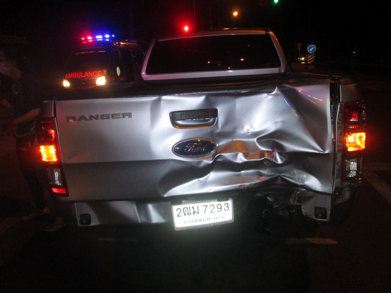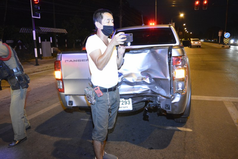 ที่เกิดเหตุเป็นสามแยกไฟแดง ถนนทางหลวง 212 สายนครพนม-ธาตุพนม ฝั่งขาเข้าตัวเมือง พบรถยนต์กระบะยี่ห้อฟอร์ดเรนเจอร์ สีบรอนซ์ ทะเบียน 2 ฒม 7293 กรุงเทพฯ สภาพท้ายรถพบรอยยุบด้านขวา มีนายสมถิ่น ทานาฤทัย วัย 40 ปี ชาว ต.นาเลิน อ.ศรีเชียงใหม่ จ.อุบลราชธานี พนักงานร้านขายกระเบื้องแห่งหนึ่งในตัวเมืองนครพนม คนขับยืนรอให้การในที่เกิดเหตุ