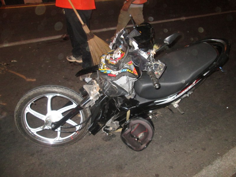 ใกล้กันพบรถ จยย.ยี่ห้อฮอนด้าเวฟ สีดำ ทะเบียน 1 กญ 5821 นครพนม ในสภาพล้มคว่ำตะแคง ตะกร้าหน้ารถยุบไปจนถึงหน้าปัดเข็มไมล์ ใกล้กันพบศพนายสุรชาติ บุญยอด อายุ 42 ปี ลูกจ้าง อบจ.นครพนม ทำงานดูแลสนามกีฬา อบจ.นครพนม ชาวบ้านดอนม่วง หมู่ 7 ต.ท่าค้อ อ.เมือง สภาพคอมีบาดแผลฉกรรจ์ยาว 20 ซ.ม. คอหัก แขนซ้ายหวิดขาด นอนเสียชีวิตคาที่