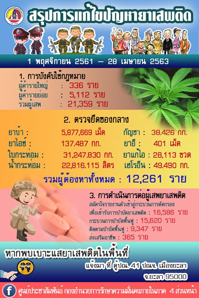 กองอำนวยการรักษาความมั่นคงภายในภาค 4 ส่วนหน้า สรุปผลการปฏิบัติงานการแก้ไขปัญหายาเสพติดในพื้นที่จังหวัดชายแดนภาคใต้ ของศูนย์ปฏิบัติการร่วมอำเภอ 37 อำเภอ (ศปร.อ. 37 อำเภอ) ตั้งแต่ 1 พฤศจิกายน 2561 – 28 เมษายน 2563 ดังนี้