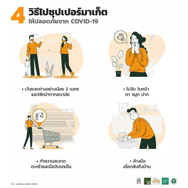 • เมื่อกลับถึงบ้าน ให้ล้างมือให้สะอาด และทำอีกครั้งหลังจากจัดเก็บสินค้าที่ซื้อมาแล้ว