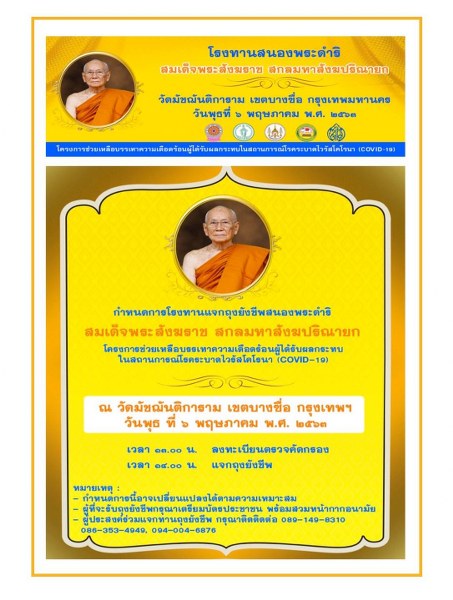 ด้วยในวันพุธที่ 6 พฤษภาคม 2563 ซึ่งเป็นวันหยุดราชการ เนื่องจากเป็นวันวิสาขบูชา ทางวัดมัชฌันติการาม (วัดน้อย) ได้จัดตั้งโรงทานแจกถุงยังชีพสนองพระราชดำริ สมเด็จพระสังฆราชสกลมหาสังฆปรินายก ตามโครงการช่วยเหลือบรรเทาความเดือดร้อนผู้ได้รับผลกระทบในสถานการณ์โรคระบาดไวรัสโคโรน่า (COVID-19) โดยมีกำหนดการดังนี้