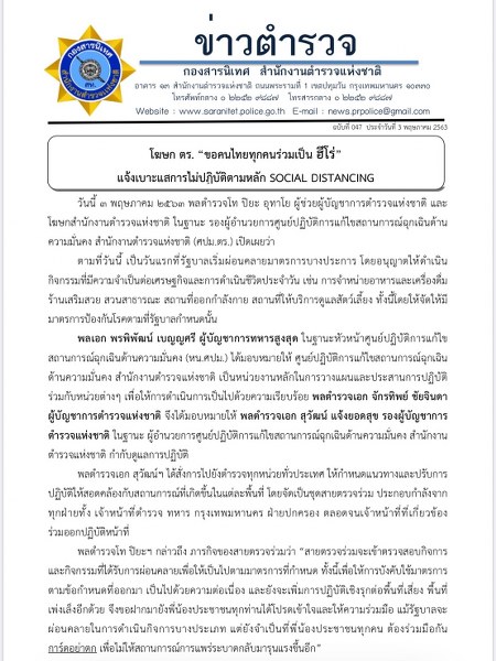 โฆษก ตร. “ขอคนไทยทุกคนร่วมเป็น ฮีโร่” แจ้งเบาะแสการไม่ปฏิบัติตามหลัก SOCIAL DISTANCING