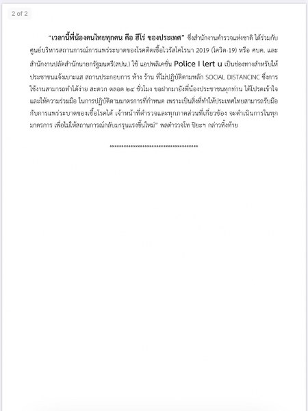 “เวลานี้พี่น้องคนไทยทุกคน คือ ฮีโร่ ของประเทศ” ซึ่งสำนักงานตำรวจแห่งชาติ ได้ร่วมกับ ศูนย์บริหารสถานการณ์การแพร่ระบาดของโรคติดเชื้อไวรัสโคโรนา 2019 (โควิด-19) หรือ ศบค. และสำนักงานปลัดสำนักนายกรัฐมนตรี (สปน.) ใช้ แอปพลิเคชั่น Police I lert u เป็นช่องทางสำหรับให้ประชาชนแจ้งเบาะแส สถานประกอบการ ห้าง ร้าน ที่ไม่ปฏิบัติตามหลัก SOCIAL DISTANCINC ซึ่งการใช้งานสามารถทำได้ง่าย สะดวก ตลอด 24 ชั่วโมง ขอฝากมายังพี่น้องประชาชนทุกท่าน ได้โปรดเข้าใจและให้ความร่วมมือ ในการปฏิบัติตามมาตรการที่กำหนด เพราะเป็นสิ่งที่ทำให้ประเทศไทยสามารถรับมือกับการแพร่ระบาดของเชื้อโรคได้ เจ้าหน้าที่ตำรวจและทุกภาคส่วนที่เกี่ยวข้อง จะดำเนินการในทุกมาตรการ เพื่อไม่ให้สถานการณ์กลับมารุนแรงขึ้นใหม่” พลตำรวจโท ปิยะฯ กล่าวทิ้งท้าย