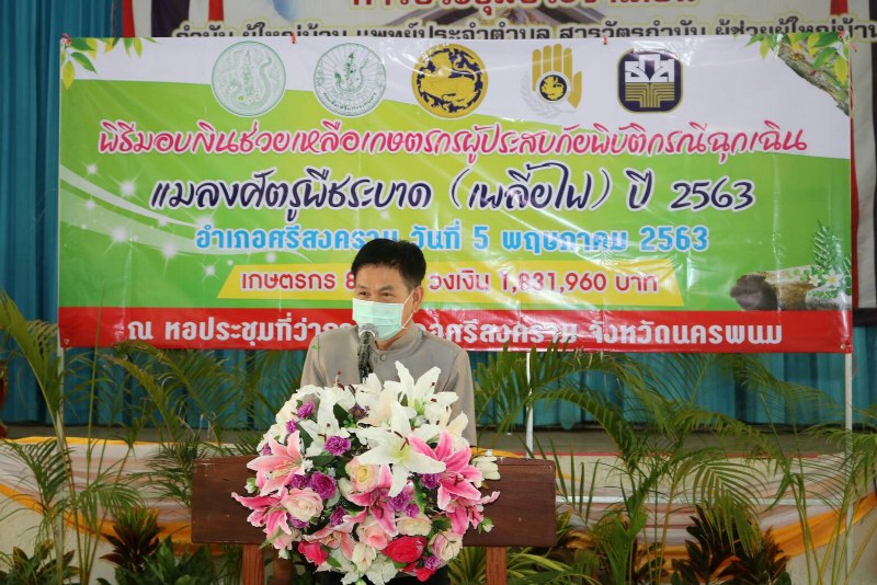 วันที่ 5 พฤษภาคม 2563 ณ ประชุมที่ว่าการอำเภอศรีสงคราม จังหวัดนครพนม โดยนายรังสรรค์ คัมภิรานนท์ รองผู้ว่าราชการจังหวัดนครพนม เป็นประธานในการมอบเงินช่วยเหลือเกษตรกรผู้ประสบภัยพิบัติกรณีฉุกเฉินแมลงศัตรูพืชระบาด (เพลี้ยไฟ) ในแตงโม ของอำเภอศรีสงคราม ซึ่งได้รับผลกระทบทั้งสิ้นจำนวน 85 ราย มีพื้นที่เสียหาย 1,084 ไร่ เป็นเงิน 1,831,690 บาท ซึ่งมีนายร่มไม้ นวลตา เกษตรจังหวัดนครพนม กล่าวรายงานถึงการมอบเงินช่วยเหลือเกษตรกรที่ได้รับผลกระทบในครั้งนี้