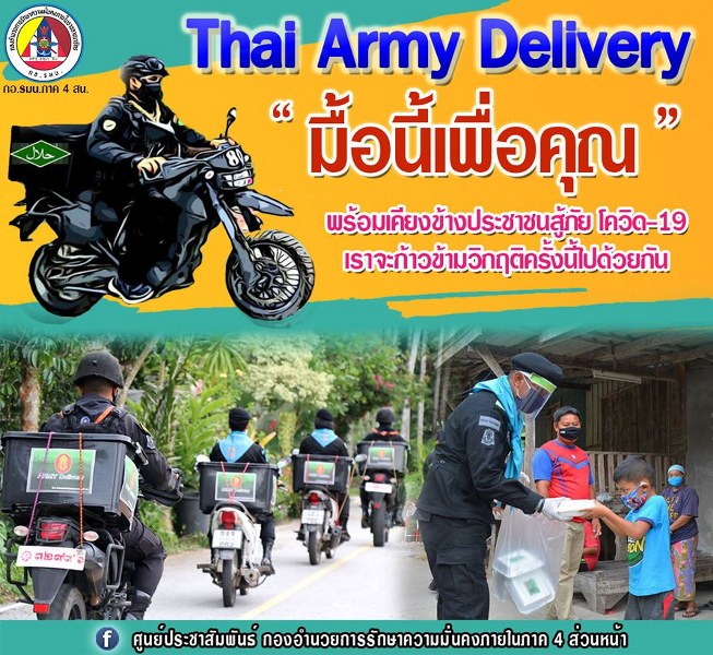 กิจกรรมดีๆที่เกิดขึ้นในพื้นที่ ที่เกิดจากจุดเล็กๆในหมู่บ้านของชุดปฏิบัติการกิจการพลเรือน สังกัด หน่วยกำลัง กอ.รมน.ภาค 4 ส่วนหน้า ขยายสู่ความร่วมมือของทุกฝ่ายที่ได้ช่วยกันจนเกิดแนวคิด “Thai Army Deliver” มื้อนี้เพื่อคุณ..ใครจะให้ร้ายโจมตีและจ้องทำร้าย แต่ในสถานการณ์วิกฤตแบบนี้ พวกเราพร้อมอยู่เคียงข้างพี่น้องประชาชน