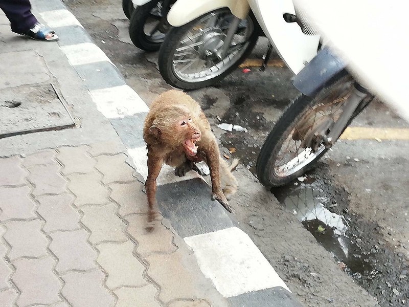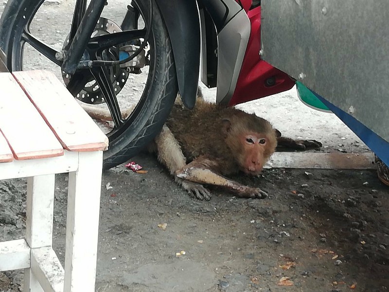 ลิงแสมโหนสายไฟแรงสูงถูกไฟช็อตตกลงพื้นได้รับบาดเจ็บรีบนำตังส่งโรงพยาบาลสัตว์เพื่อส่งต่ออภิบาลสัตว์ห้วยปรือ