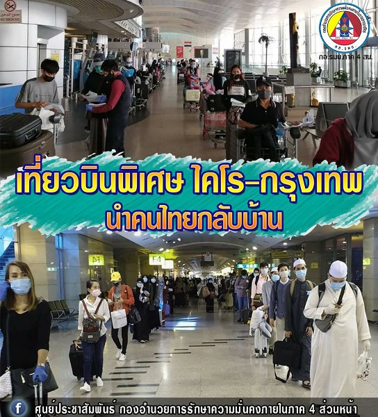 เมื่อวันที่ 7 พ.ค. 2563 สถานเอกอัครราชทูต ณ กรุงไคโร ได้ดำเนินการส่งคนไทยในสาธารณรัฐอาหรับอียิปต์ที่ได้รับผลกระทบจากการแพร่ระบาดของเชื้อ COVID – 19 กลับประเทศไทยจำนวน 199 คน ด้วยเที่ยวบินพิเศษของสายการบิน Egypt Air โดยเที่ยวบินดังกล่าวจะเดินทางถึงกรุงเทพฯ ในวันที่ 8 พฤษภาคม 2563 ทั้งนี้ ผู้โดยสารทุกคนจะถูกกักตัวเป็นเวลา 14 วัน เมื่อเดินทางถึงประเทศไทย