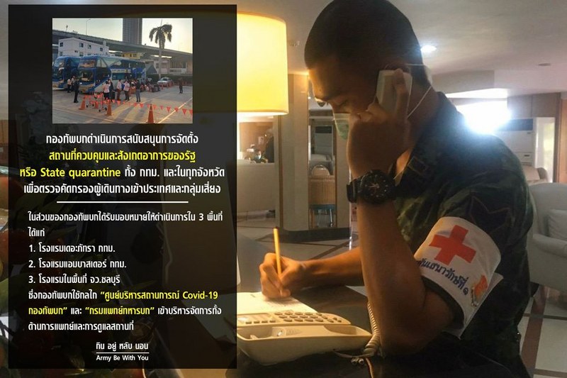 กองทัพบกดำเนินการสนับสนุนการจัดตั้ง สถานที่ควบคุมและลังเกตอาการของรัฐ หรือ State quarantine ทั้ง กทม. และในทุกจังหวัด เพื่อตรวจดักรองผู้เดินทางเข้าประเทศและกลุ่มเสี่ยง