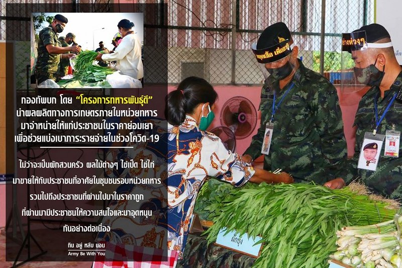 กองทัพบก โดย “โครงการทหารพันธุ์ดี” นำผลผลิตทางการเกษตรภายในหน่วยทหาร มาจำหน่ายให้แก่ประชาชนในราคาย่อมเยา เพื่อช่วยแบ่งเบาภาระรายจ่ายในช่วงโควิด – 19