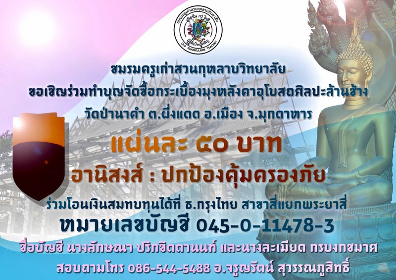 ร่วมบุญได้ที่ ธ.กรุงไทย สาขาสี่แยกพระยาสี่ หมายเลขบัญชี 045-0-11478-3 ชื่อบัญชีนางลักษณา ปริกขัตตานนท์ และนางละเมียด กรบงกชมาศ สอบถามรายละเอียด โทร.086-544-5488 อ.จรูญรัตน์ สุวรรณภูสิทธิ์