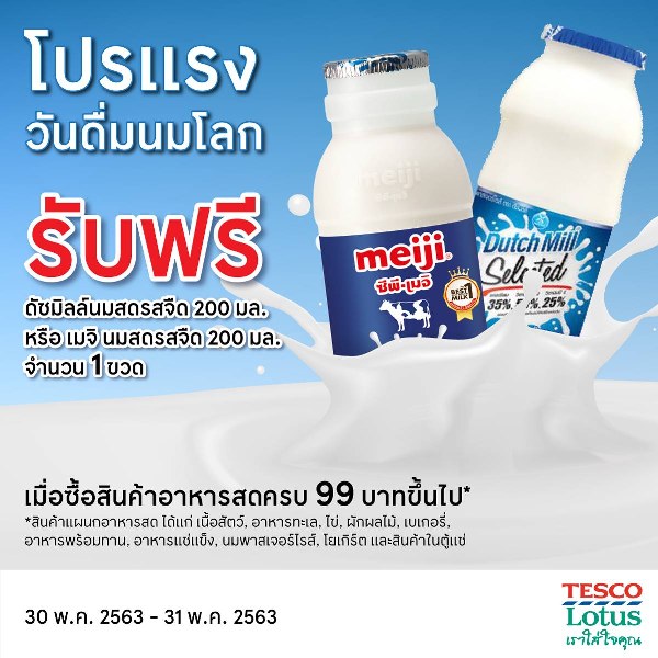 วันที่ 29 พฤษภาคม 2563 : เทสโก้ โลตัส จัดโปรโมชั่นชวนคนไทยดื่มนมใน “วันดื่มนมโลก” มอบนมสดพาสเจอร์ไรส์ ขนาด 200 มล. 1 ขวดฟรี! (จำกัด 1 ชิ้น/1 ใบเสร็จ) เมื่อซื้อสินค้าที่แผนกอาหารสดมูลค่า 99 บาทขึ้นไป ตั้งแต่วันที่ 30 ถึง 31 พฤษภาคม 2563 นี้ ที่ เทสโก้ โลตัส ทุกสาขา พร้อมมอบโปรโมชั่นสุดคุ้ม ลดราคาสูงสุดถึง 20 เปอร์เซ็นต์จากราคาปกติสำหรับสินค้าผลิตภัณฑ์นมเปรี้ยว,นมสดพาสเจอร์ไรส์,โยเกิร์ต และ โยเกิร์ตพร้อมดื่ม ที่ร่วมรายการตั้งแต่ วันที่ 28 พฤษภาคม ถึง 17 มิถุนายน 2563