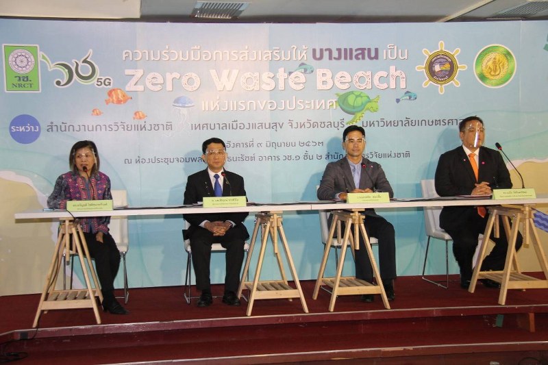 วันที่ 9 มิถุนายน 2563 เวลา 13.30 – 15.00 น. ณ ห้องประชุมจอมพลสฤษดิ์ ธนะรัชต์ ชั้น 2 อาคาร วช. 1 ถนนพหลโยธิน เขตจตุจักร กรุงเพทฯ : การประกาศเจตนารมณ์ความร่วมมือทั้ง 3 หน่วยงาน ระหว่าง ศาสตราจารย์ นายแพทย์สิริฤกษ์ ทรงศิวิไล เลขาธิการคณะกรรมการวิจัยแห่งชาติ นายณรงค์ชัย คุณปลื้ม นายกเทศมนตรีเมืองแสนสุข และ ดร.จงรัก วัชรินทร์รัตน์ รักษาราชการแทนอธิการบดี มหาวิทยาลัยเกษตรศาสตร์ และดร.ขวัญฤดี โชติชนาทวีวงศ์ ผู้อำนวยการศูนย์วิจัยยุทธศาสตร์สิ่งแวดล้อม เพื่อความร่วมมือในการผลักดันให้หาดบางแสนเป็น Zero Waste Beach แห่งแรกของประเทศ และเป็นประโยชน์ต่อการจัดการขยะเชิงพื้นที่ต้นแบบ และมุ่งเน้นการนำไปใช้ประโยชน์ได้จริง นำไปสู่การสร้างเศรษฐกิจหมุนเวียนที่เกี่ยวข้องกับขยะ และเป็นส่วนหนึ่งของการขยายความร่วมมือ รวมทั้งสร้างการตระหนักรู้และสร้างจิตสำนึกของปัญหาขยะในทะเลของประเทศไทย นำไปสู่การแก้ปัญหาร่วมกันต่อไป