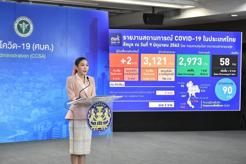 วันนี้ (9 มิถุนายน 2563) ที่ ศูนย์บริหารสถานการณ์โควิด19 (ศบค.) กระทรวงสาธารณสุข จ.นนทบุรี แพทย์หญิงพรรณประภา ยงค์ตระกูล ผู้ช่วยโฆษกศูนย์บริหารสถานการณ์โควิด 19 แถลงความคืบหน้าสถานการณ์ผู้ติดเชื้อไวรัสโคโรนา 2019 ในประเทศไทยวันนี้ ว่ามีผู้ติดเชื้อรายใหม่ 2 ราย เป็นคนไทยที่เดินทางกลับจากต่างประเทศและเข้ารับการเฝ้าระวังในสถานที่รัฐจัดให้ (ซาอุดิอาระเบีย 1 ราย, เนเธอร์แลนด์ 1 ราย) ไม่มีผู้ป่วยกลับบ้าน ยอดผู้ป่วยกลับบ้านสะสม 2,973 ราย หรือคิดเป็นร้อยละ 95.26 ของผู้ป่วยทั้งหมด มีผู้ป่วยที่ยังรักษาอยู่ในโรงพยาบาล 90 ราย หรือร้อยละ 2.88 ของผู้ป่วยทั้งหมด ไม่มีผู้เสียชีวิตเพิ่ม รวมผู้เสียชีวิตสะสม 58 ราย ผู้ป่วยสะสมทั้งสิ้น 3,121 ราย ประเทศไทยในช่วง 2 สัปดาห์ที่ผ่านมา ยังคงพบผู้ติดเชื้อที่เดินทางกลับจากต่างประเทศและอยู่ในสถานที่เฝ้าระวังที่รัฐจัดให้ อย่างไรก็ตามหน่วยงานทุกภาคส่วน ยังคงต้องช่วยกันเฝ้าระวัง ป้องกัน ควบคุมโรคอย่างต่อเนื่อง และติดตามสถานการณ์การแพร่ระบาดอย่างใกล้ชิด
