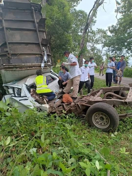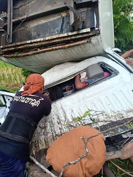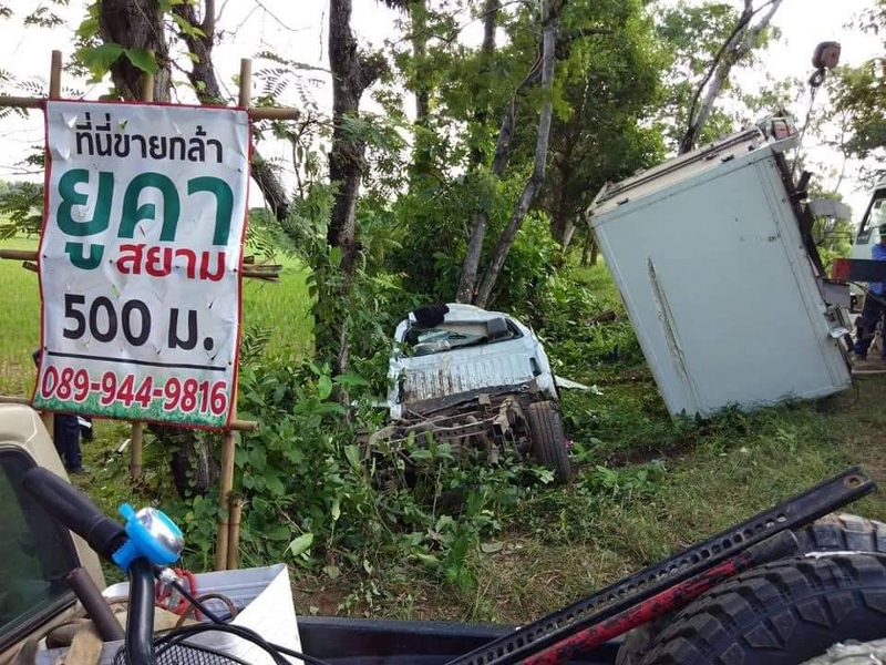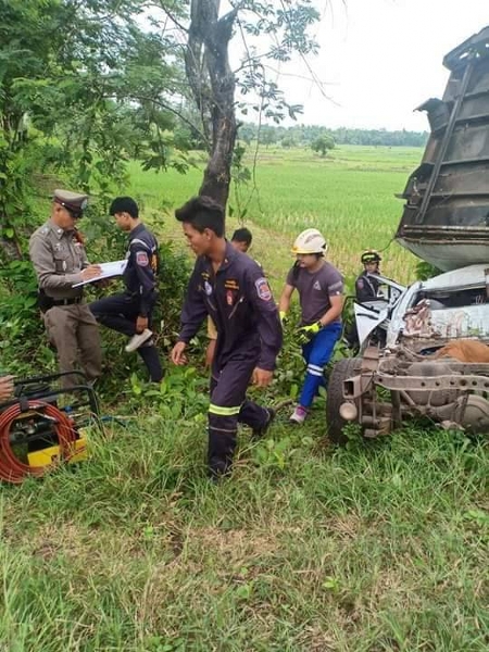 มุกดาหาร หนุ่มขับรถกระบะบรรทุกไก่สดแช่แข็งโดยมีแฟนสาวโดยสารมาด้วย คนขับเกิดหลับในขับพุ่งลงข้างทางชนต้นไม้อย่างแรงส่งผลให้รถพังยับเยิน คนขับพร้อมแฟนสาวติดในซากรถ ต้องใช้เครื่องมือตัดถ่างเหล็ก เพื่อช่วยเหลือออกมาได้โดยได้รับบาดเจ็บสาหัส