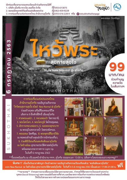นายอภิวัฒน์ ทับทิมโต ผู้อำนวยการสำนักงาน การท่องเที่ยวแห่งประเทศไทย (ททท.) สำนักงานสุโขทัย กล่าวเชิญชวนนักท่องเที่ยวเข้าร่วมกิจกรรมท่องเที่ยวโครงการ “ท่องเที่ยวไหว้พระสุขกายสุขใจ สไตล์ New Normal @สุโขทัย” ในวันจันทร์ที่ 6 กรกฎาคม 2563 โดย ททท.สำนักงานสุโขทัย ได้จัดกิจกรรมท่องเที่ยวในลักษณะเส้นทางไหว้พระในจังหวัดสุโขทัย เสนอขาย Package ท่องเที่ยวแบบครึ่งวัน ในราคา 99 บาท เปิดรับสมัครลงทะเบียนแบบจำกัด จำนวนที่ 60 คน เดินทางโดยรถสองแถวไม้ หรือรถคอกหมู