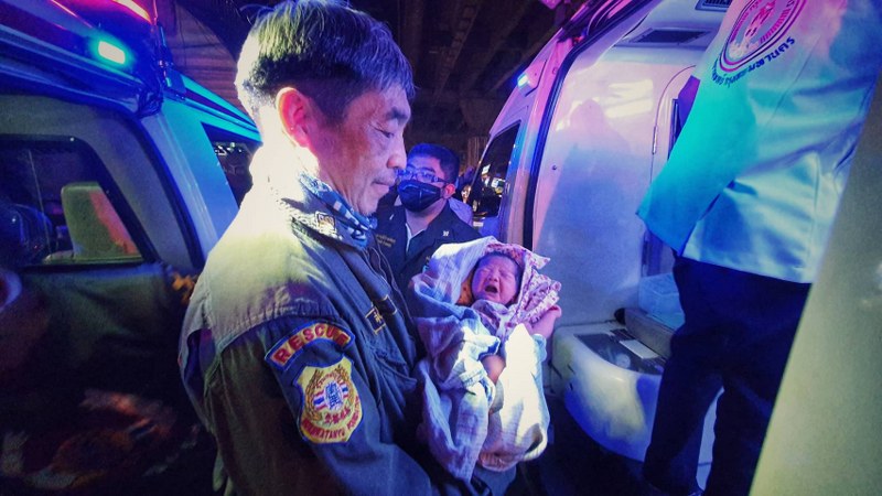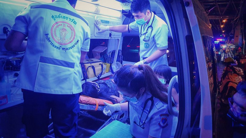รถพยาบาลสำนักการเเพทย์กรุงเทพมหานคร จุดจอดเทพลีลามารับเด็ก และแม่ต่อจากอาสาสมัครมูลนิธิร่วมกตัญญู ปฐมพยาบาลและนำส่งต่อไปที่โรงพยาบาลสิรินธร
