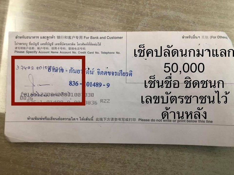ขอยืมเงิน 50,000 บาท โดยใช้เช็คของบุคคลอื่น แต่ตนเองเซ็นต์ชื่อ พร้อมกับระบุเลขบัตรประชาชนของตนไว้