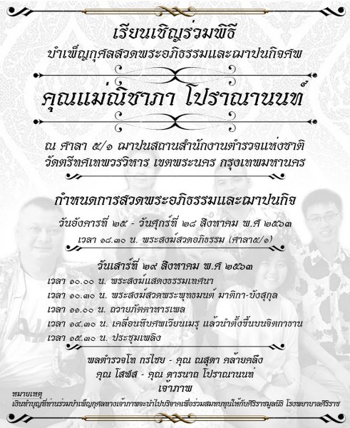 ขอเรียนเชิญร่วมพิธีบำเพ็ญกุศล สวดพระอภิธรรมและฌาปนกิจศพคุณแม่ณิชาภา โปราณานนท์ กำหนดสวดพระอภิธรรมและฌาปนกิจ