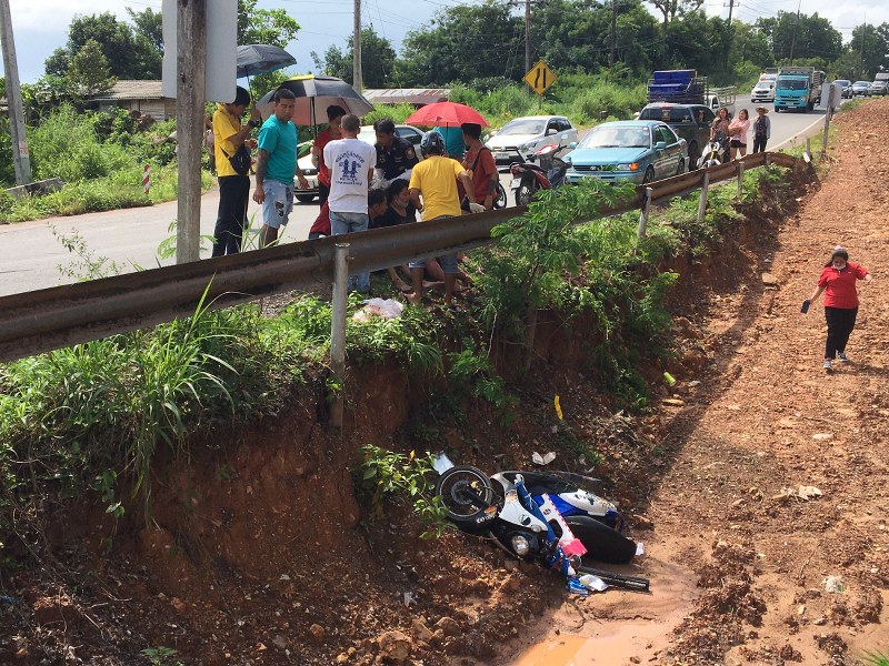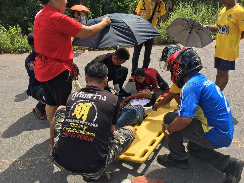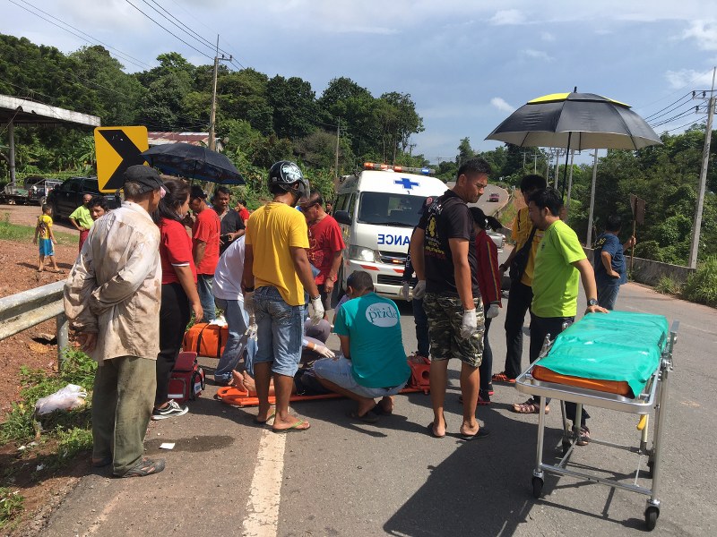ตราด /หนุ่มกัมพูชาซิ่ง จยย.ชนท้ายสามีภรรยาตกถนน หวิดดับ สุดท้ายตัวเองสลบเหมือดคาที่
