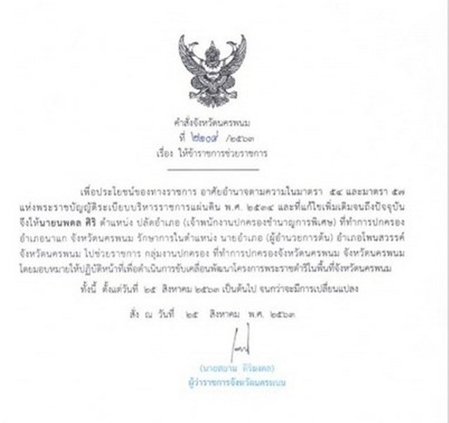 ล่าสุด วันที่ 25 สิงหาคม 2563 หลังจากคณะกรรมการสอบสวนข้อเท็จจริง มี นายพรต ภูภักดิ์ ปลัดจังหวัดนครพนมเป็นประธาน ได้ลงพื้นที่สอบสวนผู้เกี่ยวข้องในที่ว่าการอำเภอโพนสวรรค์ จนถึงเวลาประมาณ 22.00 น. ของวันที่ 24 สิงหาคม ก็รายงานต่อ ผวจ.นครพนม ซึ่งในวันรุ่งขึ้นก็ได้มีคำสั่งจังหวัดนครพนม ที่ 2208/2563 เรื่องให้ข้าราชการช่วยราชการ โดยมีคำสั่งให้ นายนพดล ศิริ รักษาการในตำแหน่ง นายอำเภอ (ผู้อำนวยการต้น) นายอำเภอโพนสวรรค์ จ.นครพนม ไปช่วยราชการ กลุ่มงานปกครอง ที่ทำการปกครองจังหวัดนครพนม โดยมอบหมายให้ปฏิบัติหน้าที่เพื่อดำเนินการขับเคลื่อนพัฒนาโครงการพระราชดำริในพื้นที่ฯนครพนม ตั้งแต่วันที่ 25 สิงหาคม 2563 จนกว่าจะมีคำสั่งเปลี่ยนแปลง