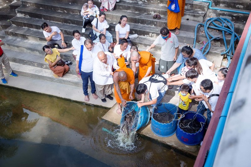 ช่วงเช้าใด้มีการปล่อยปลาดุกและปลาหมอ เป็นกุศลใหญ่จะส่งผลให้ชีวิตดีขึ้นและแก้ไขดวงชะตาได้ให้พ้นเคราะห์ จากนั้นเป็นพิธีสงฆ์และพิธีทำบุญอายุวัฒนมงคล พระครูโสภณนาคกิจ เจ้าคณะอำเภอบ้านนา จังหวัดนครนายก