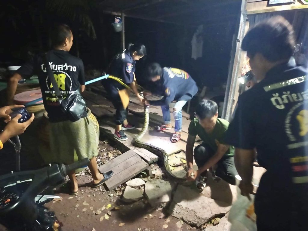 เมื่อช่วงเวลา 20.00 นาฬิกา คืนวันที่ 8 กันยายน 2563 ที่บริเวณซอยหลังองค์การโทรศัพท์ เจ้าหน้าที่กู้ภัยสว่างบุญช่วยเหลือธรรมสถานตราดเขต 2 คลองใหญ่ ได้รับแจ้งจากนางพรเจ้าของบ้านว่าพบงูเหลือมตัวใหญ่เลื้อยเข้ามาจะมาเขมือบไก่ในเล้าที่ตนเลี้ยงไว้หลายสิบตัวล้วนแต่ไก่ชนทั้งหมด นางพรเล่าให้ฟังว่าตนกําลังล้างจานอยู่ด้านนอกบ้าน เหลือบไปเห็นกำลังคลานเข้ามาใต้ไม้กระดานที่ตนกําลังล้างอยู่ หลังจากทางเจ้าหน้าที่กู้ภัยได้รับแจ้งจึงพร้อมด้วยอุปกรณ์การจับงูพร้อมกระสอบปุ๋ย 1 ลูก เพื่อจับงูเหลือมใส่กระสอบแล้วนําไปปล่อยคืนสู่ป่าธรรมชาติ