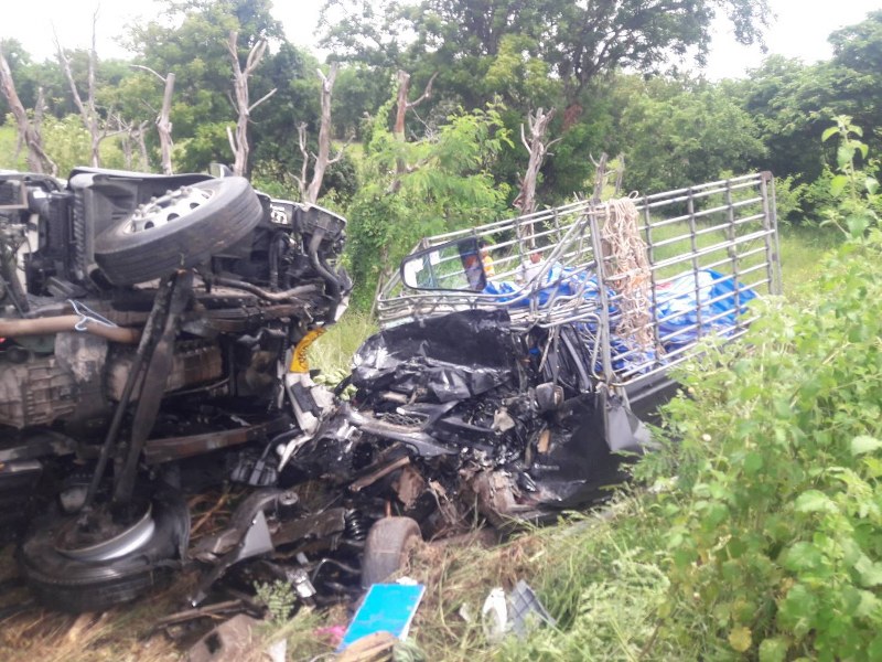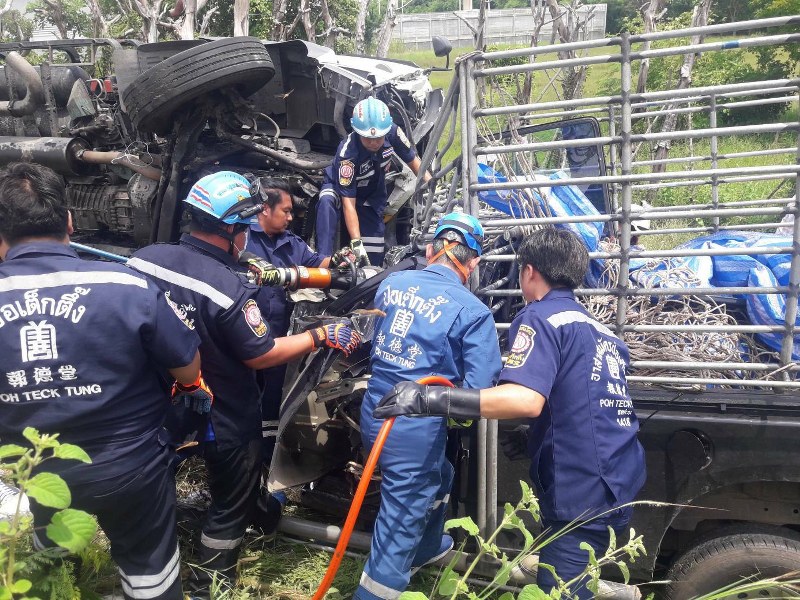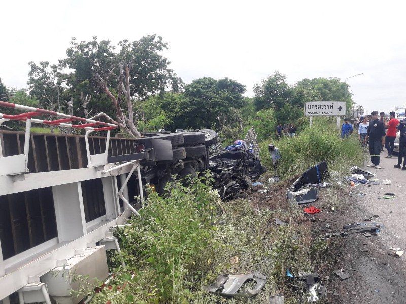 ที่เกิดเหตุพบรถพ่วงหัวลากบรรทุกตู้คอนเทนเนอร์ ยี่ห้อ ฮีโน่ สีขาว หมายเลขทะเบียนตัวแม่ 84-5097 กรุงเทพมหานคร หมายเลขทะเบียนตัวลูก 64-15066 กรุงเทพมหานคร พลิกคว่ำตกลงไปอยู่ข้างถนน ในสภาพช่วงหน้ารถพังยับ ชนอัดติดกับรถยนต์กระบะยี่ห้อ Chevrolet สีดำ หมายเลขทะเบียน ขจ-7106 สมุทรสาคร หน้ารถพังยับยุบถึงห้องโดยสาร เศษชิ้นส่วนเครื่องยนต์แตกกระจายไปทั่วบริเวณ ตอนหน้าพบร่างผู้เสียชีวิตจำนวน 2 ราย เป็นชาย 1 ราย และหญิง 1 ราย ถูกอัดก๊อบปี้เสียชีวิตติดคาซากรถ ทางเจ้าหน้าที่กู้ภัยฯ ต้องใช้อุปกรณ์ในการตัดถ่าง นำร่างผู้เสียชีวิตทั้ง 2 รายออกมาได้ในเวลาต่อมา