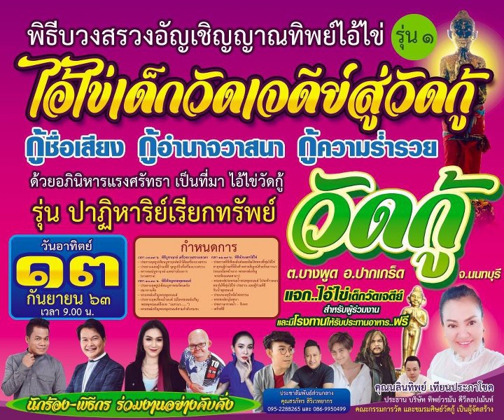 พันเอก เขษมวิศว์ สาคุณ ผู้อำนวยการส่วนแผนและโครงการศูนย์ประสานการปฏิบัติที่ 4 กองอำนวยการรักษาความมั่นคงภายในราชอาณาจักร เป็นประธาน ในพิธีอัญเชิญดวงวิญญาณทิพย์ ไอ้ไข่ จากวัดเจดีย์ สู่วัดกู้ ปากเกร็ด นนทบุรี ขอให้ สำเร็จ ทุกประการ สาธุ สาธุ สาธุ