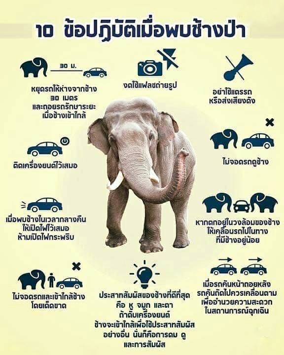 - ไม่ควรจอดรถดูช้าง เพราะอาจมีรถคันอื่นตามมา แล้วรถของคุณกีดขวางรถผู้อื่น จนเป็นเหตุให้ถูกทำร้ายแทนรถ