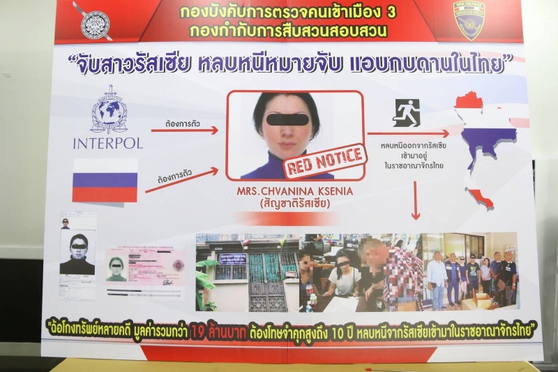 อีกทั้งได้ประกาศสืบจับลงในระบบตำรวจสากล (INTERPOL) แล้ว เมื่อทราบข้อมูล เจ้าหน้าที่ กก.สส.บก.ตม.3 จึงได้ออกสืบสวนติดตามกระทั่งพบตัว จึงได้ขออนุมัติ ผบก.ตม.3 เพิกถอนการอนุญาตให้อยู่ในราชอาณาจักรและควบคุมตัว MRS.KSENIA ไว้เพื่อผลักดันส่งกลับไปยังประเทศรัสเซียดำเนินคดีตามกฎหมายต่อไป