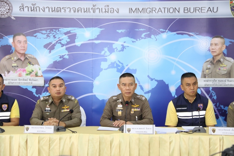 เมื่อวันศุกร์ที่ 12 ก.ค.62 ที่ห้องแถลงข่าว สตม.สวนพลู : พลตำรวจโท สมพงษ์ ชิงดวง รักษาราชการแทนผู้บัญชาการสำนักงานตรวจคนเข้าเมือง (รรท.ผบช.สตม.) พร้อมด้วย พลตำรวจตรี ภาคภูมิภิภัทฒ์ สัจจพันธุ์,พลตำรวจตรี กฤษกร พลีธัญญวงศ์,พลตำรวจตรี อิทธิพล อิทธิสารรณชัย,พลตำรวจตรี ณฐพล แสวงกิจ,พลตำรวจตรี สรายุทธ สงวนโภคัย รองผู้บัญชาการสำนักงานตรวจคนเข้าเมือง (รองผบช.สตม.),พลตำรวจตรี สุรพงษ์ ชัยจันทร์ รองผู้บัญชาการตำรวจภูธรภาค 7 (รองผบช.ภ.7) ปฏิบัติราชการ รองผู้บัญชาการสำนักงานตรวจคนเข้าเมือง (รองผบช.สตม.),พลตำรวจตรี อาชยน ไกรทอง ผู้บังคับการตรวจคนเข้าเมือง 3 (ผบก.ตม 3),,พันตำรวจเอก ภาส สิริสุขะรองผู้บังคับการตรวจคนเข้าเมือง 3 (รองผบก.ตม.3) และพันตำรวจเอก รัชธพงศ์ เตี้ยสุด ผู้กำกับการสืบสวนสอบสวน กองบังคับการตรวจคนเข้าเมือง 3 (ผกก.สส.บก.ตม.3)
