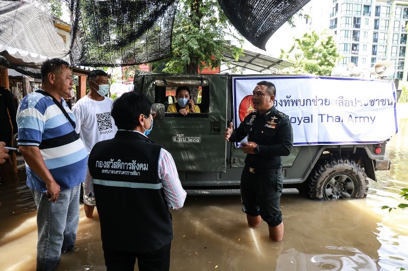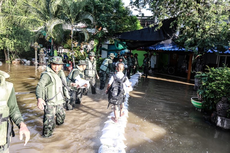 กำลังพลทหารได้ก่อกระสอบทราย จำนวน 500 กระสอบ เพื่ออำนวยความสะดวกเป็นทางสัญจรให้กับประชาชนรวมไปถึงบุตรหลานผู้ประสบเหตุน้ำท่วมได้เดินทางเข้าออกพื้นที่ได้อย่างสะดวกและปลอดภัย ซึ่งเป็นการช่วยเหลือผู้ประสบภัยและบรรเทาทุกข์ ในเบื้องต้น