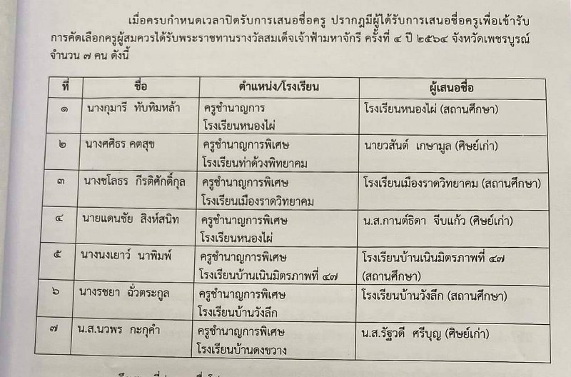 7 ครูคนดีเพชรบูรณ์ได้รับการเสนอชื่อพิจารณาคัดเลือกครูรางวัลสมเด็จเจ้าฟ้ามหาจักรี