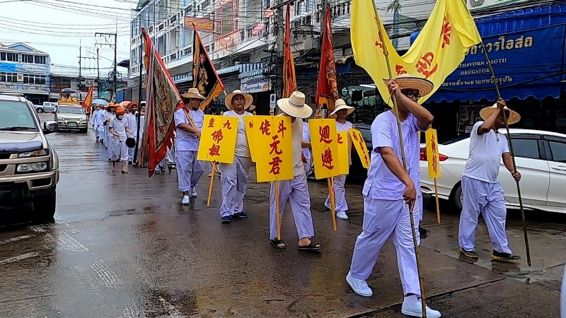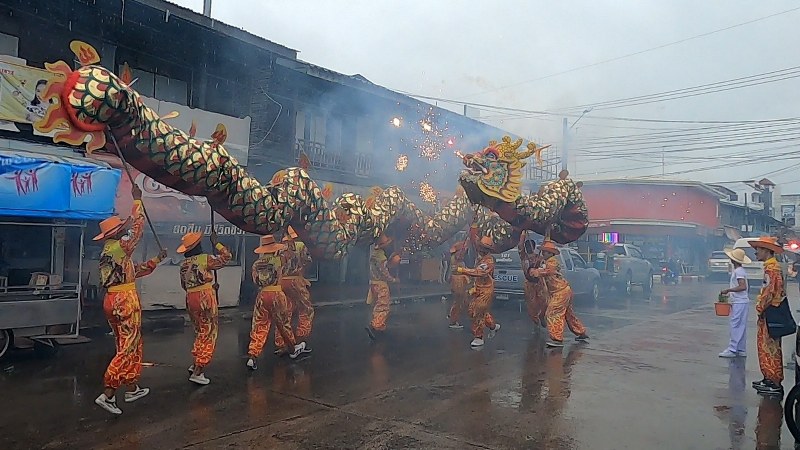 สัตหีบ แห่มังกรรอบตลาดท่ามกลางสายฝน อัญเชิญเทพเจ้าในเทศกาลกินเจ