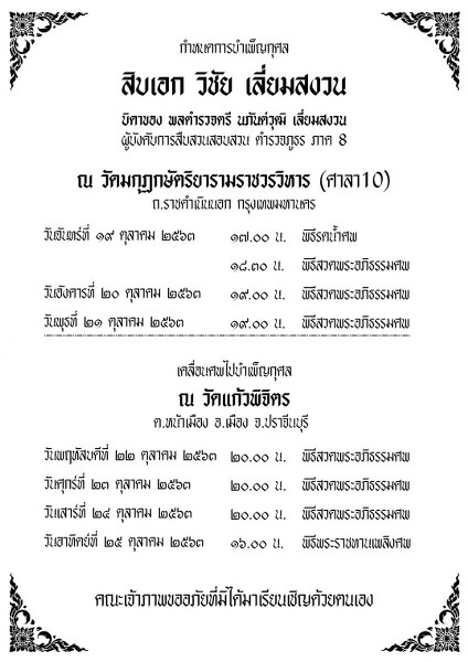 กำหนดการบำเพ็ญกุศล สิบเอก วิชัย เลี่ยมสงวน บิดาของ พลตำรวจตรี นภันต์วุฒิ เลี่ยมสงวน ผู้บังคับการสืบสวนสอบสวน กองบัญชาการตำรวจภูธรภาค 8 ณ วัดมกุฎกษัตริยารามราชวรวิหาร (ศาลา 10) ถ.ราชดำเนินนอก กรุงเทพมหานคร