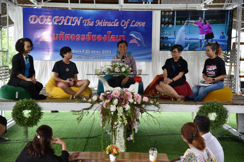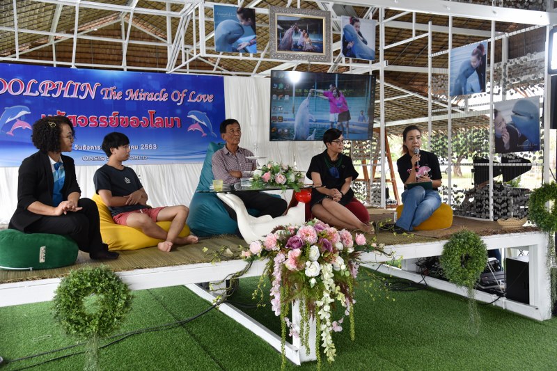 ที่ OASIS SEAWORD จ.จันทบุรี ผู้อำนวยการการท่องเที่ยวแห่งประเทศไทย สำนัก งานจันทบุรี, นายกสมาคมส่งเสริมการท่องเที่ยว จ.จันทบุรี, ประธานสภาอุตสาหกรรมการท่องเที่ยว จ.จันทบุรี, นายวิชัย วัฒนพงศ์ ประธานผู้ก่อตั้ง OASIS SEAWORD จ.จันทบุรี และ นางสาววณิชชา วัฒนพงศ์ ได้ร่วมแถลงข่าวต่อสื่อมวลชนถึงกิจกรรม Dolphin the Miracle of Love เปิดตัวการท่องเที่ยว มิติใหม่ ท่ามกลางธรรมชาติ และแคมเปญเยี่ยวยาผู้ประสบภาวะทางสมองและอารมณ์ ในการบำบัดรักษา