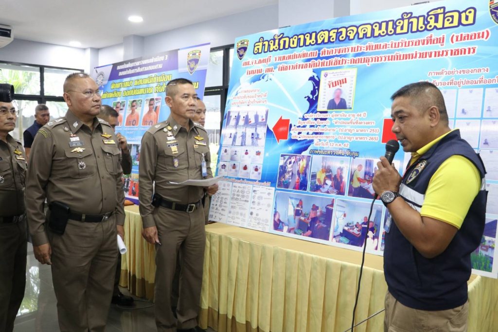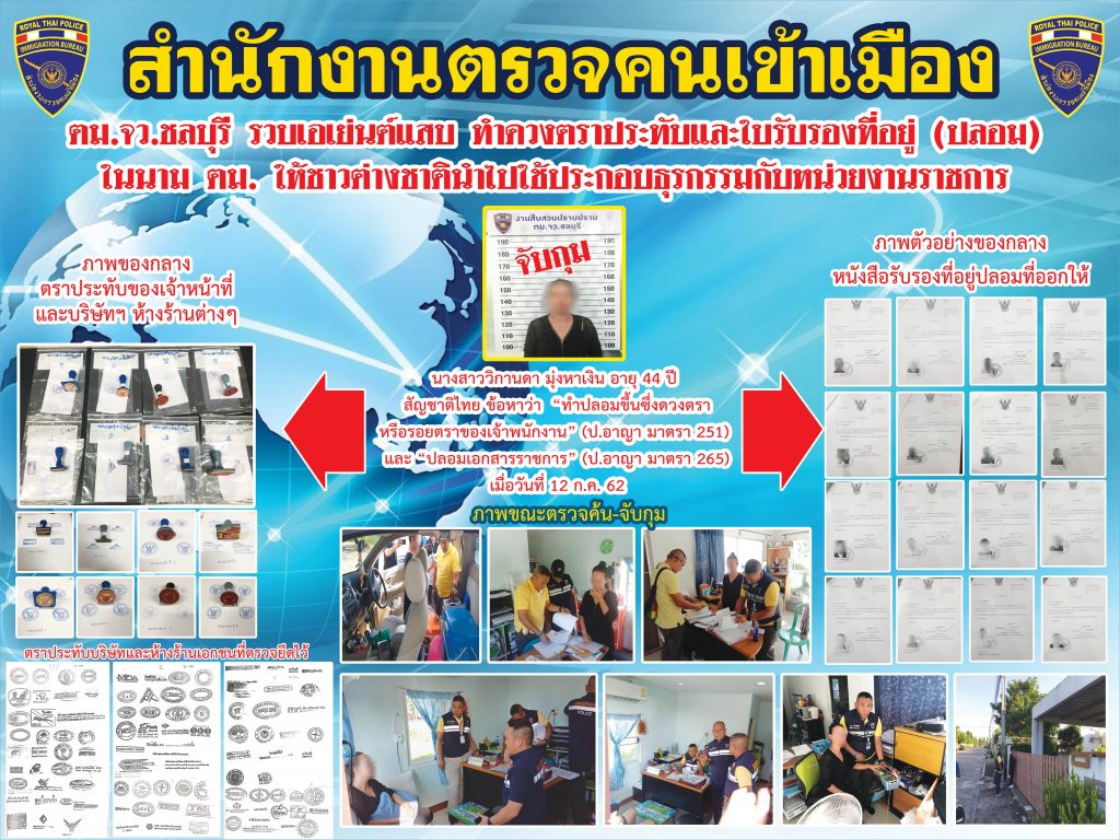 จึงได้ตรวจยึดไว้เป็นของกลาง ซึ่งต่อมา นส.วิกานดาฯ ได้นำเจ้าหน้าที่ตำรวจ เข้าตรวจสอบภายในออฟฟิตพบเอกสารรับรองที่พักอาศัยของคนต่างด้าวปลอมอีกจำนวนมากซึ่งเอกสารดังกล่าวบางส่วนพร้อมสำหรับใช้ในการยื่นขอใบอนุญาตใบขับขี่ หรือเปลี่ยนแปลงกรรมสิทธิ์รถให้กับคนต่างด้าว และยังพบรอยตราประทับบริษัท และห้างร้านเอกชนอีกจำนวนมากจึงได้ตรวจยึดไว้ จากนั้นผู้ถูกจับได้พาชุดจับกุมไปทำการตรวจยึดตราประทับสำนักงานตรวจคนเข้าเมืองปลอมอีก จำนวน 3 อัน ที่บ้านพักเลขที่ 88/437 หมู่บ้านกลางสวนตะเคียนเตี้ย หมู่ที่ 2 ต.ตะเคียนเตี้ย อ.บางละมุง จ.ชลบุรี