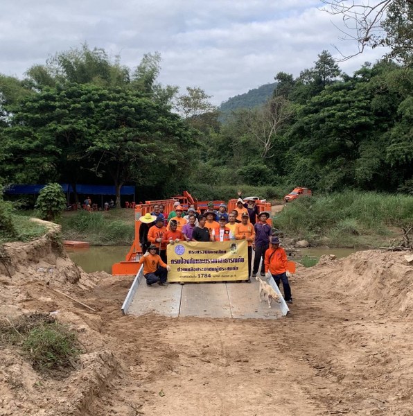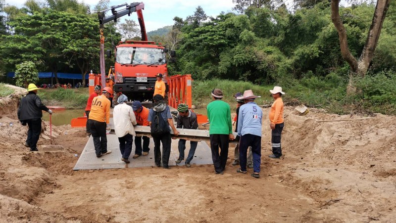 จังหวัดมุกดาหารติดตั้งสะพานเบลีย์แทนสะพานไม้ที่ชำรุดข้ามลำห้วยบางทราย บ้านมะนาว หมู่ 2 ตำบลพังแดง อ.ดงหลวง บรรเทาจากผลกระทบพายุฝนในช่วงที่ผ่านมา