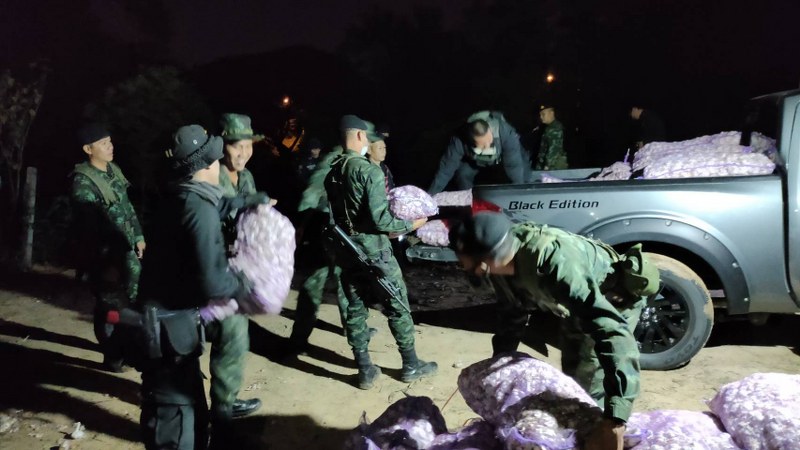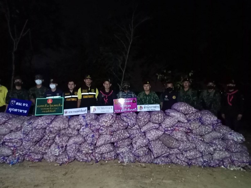 มุกดาหาร – กองร้อยทหารพราน ร่วม กองกำลังสุรศักดิ์มนตรี ศุลกากรหน่วยข่าวกองฝ่ายทหารสำนักการข่าว กอ.รมน. ตำรวจตรวจคนเข้าเมือง ฝ่ายปกครองและ นรข. สกัดจับกระเทียมแห้งเถื่อนไม่ผ่านพิธีการศุลกากร ลักลอบขนข้ามโขงมาทางเรือหางยาวเข้ามาแนวชายแดนริมฝั่งโขงถูกเจ้าหน้าที่สกัดจับยึดได้ 100 กระสอบหนัก 2,000 กิโลกรัมมูลค่ากว่า 200,000 บาท