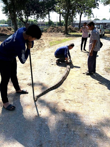 นครนายก -ช่างรับเหมา ทำการปรับภูมิทัศน์พบงูเหลือมตัวใหญ่นอนอยู่ในป่าข้างทางจับส่งคืนสู่แหล่งธรรมชาติ