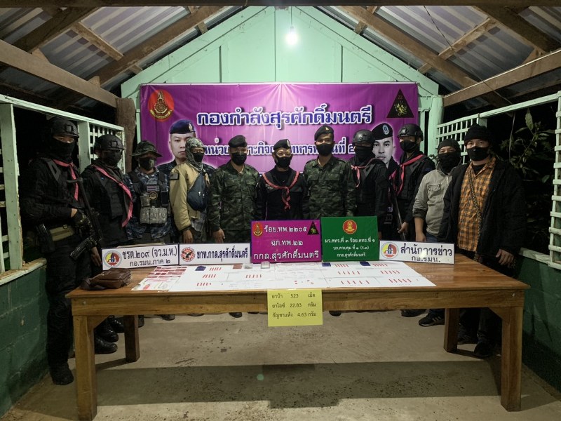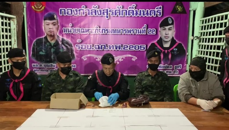 เมื่อวันที่ 12 พฤศจิกายน 2563 เวลา 12.00 น. ภายใต้การอำนวยการของ พล.ต.บุญสิน พาดกลาง ผู้บังคับการกองกำลังสุรศักดิ์มนตรี, พ.อ.พิทักษ์พล ชูศรี ผู้บังคับการกรมทหารพรานที่22, กองบังคับการเฉพาะกิจทหารพรานที่21 ได้รับแจ้งจากแหล่งข่าวในพื้นที่บ้านม่วง ตำบลบ้านเหล่า อำเภอคำชะอี จังหวัดมุกดาหาร ว่ามีนายอ้นและพวง มีพฤติกรรมเกี่ยวข้องกับยาเสพติดและจำหน่ายให้กับวัยรุ่นในพื้นที่บ้านม่วงหมู่8 และพื้นที่ใกล้เคียง เจ้าหน้าที่จึงได้ทำการร่วมกันวางแผนเข้าจับกุม จึงสั่งการให้ พ.ต.สิทธิศักดิ์ สิงหะสุริยะ ผู้บังคับกองร้อยทหารพรานที่ 2205 และ ร.ต.สุพัฒน์ ลาดบาศรี มว.คทร.ที่ 3 ร้อย คทร.ที่ 1, บูรณาการด้านการข่าวร่วมกับ ชปข.สขว.กอ.รมน., ขกท.กกล.สุรศักดิ์มนตรี, ชปข.ที่ 7 กกล.สุรศักดิ์มนตรี, ชรต.208 กอ.รมน.ภาค 2 สนธิกำลังลงพื้นที่ตรวจสอบติดตามเป้าหมาย