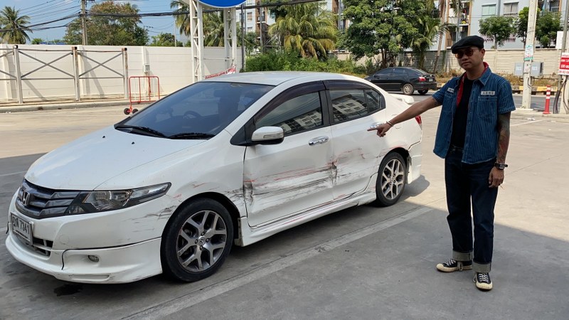 เมื่อเวลา 14.00 น.วันที่ 17 พ.ย.63 ผู้สื่อข่าวได้รับเรื่องร้องเรียนจากนายมนตรี ทองวนิช อายุ 40 ปี อาชีพรับจ้าง บ้านเลขที่ 99/93 หมู่8 ต.เสาธงหิน อ.บางใหญ่ จ.นนทบุรี กรณีรถยนต์เก๋งยี่ห้อ ฮอนด้า รุ่นซิตี้ ทะเบียน ฎฬ 7341 กรุงเทพมหานคร ถูกคู่กรณีขับรถยนต์เก๋งสีแดง ไม่ทราบหมายเลขทะเบียนขับออกมาจากศูนย์อาหารทำให้เกิดการเฉี่ยวชนกัน ที่เกิดเหตุเป็นถนน 2 เลน อยู่ตรงข้ามร้านอาหารคอนบาร์ ถนนเลียบคลองถนน หมู่11 ต.บางรักพัฒนา อ.บางบัวทอง จ.นนทบุรี หลังเกิดเหตุได้เข้าแจ้งความไว้ที่ สภ.บางบัวทอง โดยมี ร.ต.อ.ศุภลักษณ์ พรหมวงศ์ รอง สว.สอบสวน เป็นเจ้าของคดี