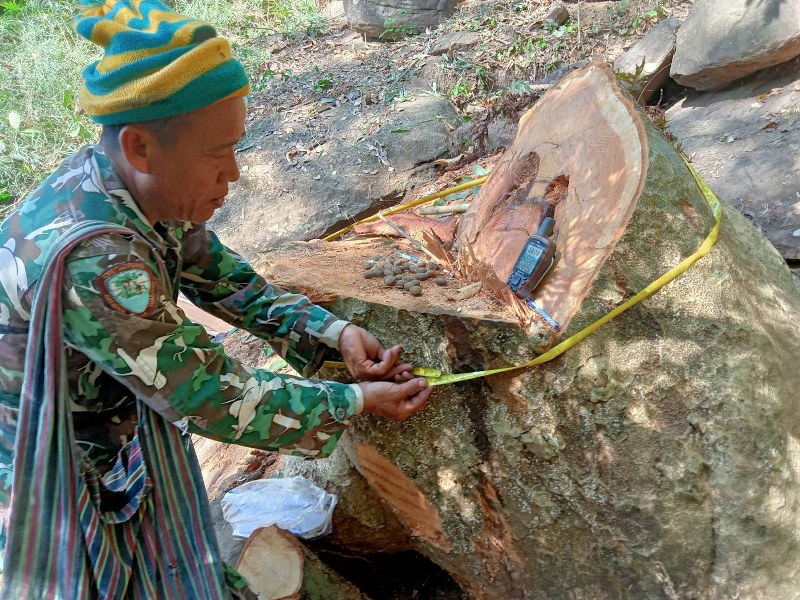 เจ้าหน้านำตัวผู้ต้องหามาที่จุดเกิดเหตุพบต้นไม้มะค่าโมงขนาดใหญ่ถูกตัดโค่นลงแปร รูปแผ่นพบจำนวน 3 แผ่นความยาว 2 เมตรกว้าง 80 เชนติเมตรสภาพใหม่สด ตรวจสอบบริเวณทางลงพบเพิ่มอีก 2 แผ่นรวมจำนวน 5 แผ่นเหลี่ยม ปริมาตร 0.20 ลูกบาศก์เมตร ตรวจสอบพบตอไม้และอุปกรณ์ที่ใช้ในการกระทำความผิด มีเลื่อยโซ่ยนต์ขนาดใหญ่จำนวน 2 เครื่อง และแกนลอนน้ำมันวางอยู่ตอไม้ ซึ่งไม้แปรรูปถูกลำเลียงลงไปจำนวนหนึ่งแล้ว เจ้าหน้าที่จึงทำการตรวจยึดไม้ของกลางพร้อมอุปกรณ์ที่ใช้ในการกระทำความผิด มีเลื่อยโซ่ยนต์ขนาดใหญ่จำนวน 2 เครื่อง และผู้ต้องหาส่ง ร.ต.อ.ภาณุ อินทองครับ ร้อยเวร สภ. ดงหลวง เพื่อดำเนินการตามกฎหมาย ซึ่งประวัตินายร่วมคิด บุตรโคตร ผู้ต้องหามีฉายาเจ้าพ่อค้าไม้พะยูงข้ามชาติ โดยใช้รถส่วนตัวพาลูกน้องไปลักลอบตัดไม้พะยูงในป่าและตามวัดต่างๆในพื้นที่ จ.มุกดาหาร