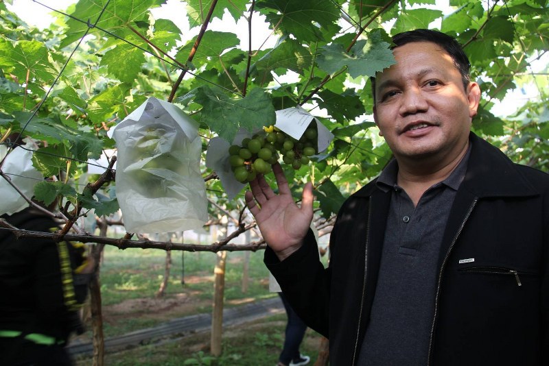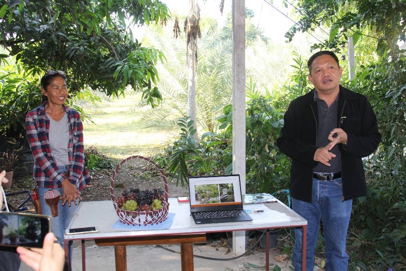 ผู้ช่วยศาสตราจารย์ ดร.พีระศักดิ์ ฉายประสาท อาจารย์ภาควิชาวิทยาศาสตร์เกษตร คณะเกษตรศาสตร์ ทรัพยากรธรรมชาติ และสิ่งแวดล้อม มหาวิทยาลัยนเรศวร จังหวัดพิษณุ โลก และหัวหน้าโครงการ การจัดการความรู้และถ่ายทอดเทคโนโลยีการผลิตองุ่นไซน์มัส แคทเชิงพาณิชย์ ที่ได้รับการสนับสนุนจากสำนักงานการวิจัยแห่งชาติ (วช.) กระทรวงการอุดมศึกษา วิทยาศาสตร์ วิจัยและนวัตกรรม (อว.) นำชมความสำเร็จในการถ่ายทอดเทคโนโลยีแก่สวนองุ่นฮักริมปิง อำเภอจอมทอง จังหวัดเชียงใหม่