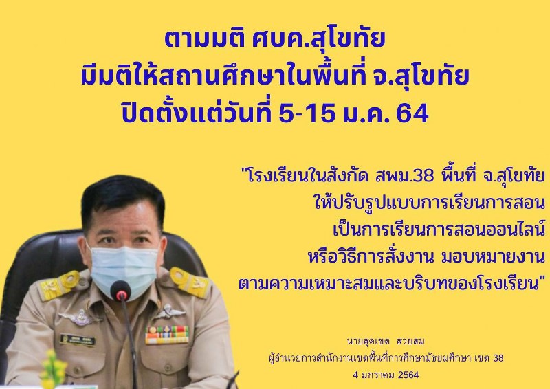 “สพม.38” ให้สถานศึกษาในสังกัดจ.สุโขทัย ปิดการเรียนด้วยเหตุผลพิเศษ 5-15 ม.ค.และปรับเรียน-สอนตามเหมาะสม
