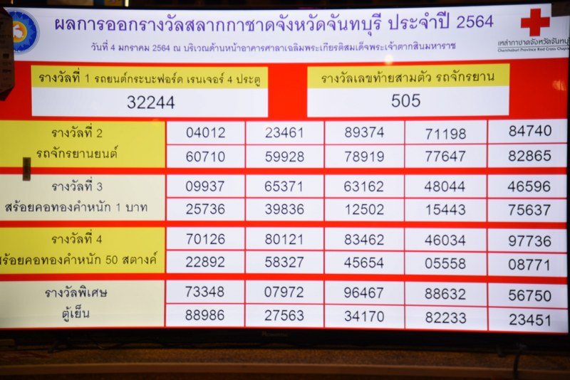 ค่ำวันนี้ ( 4 ม.ค.64 ) ที่ บริเวณด้านหน้าอาคารศาลาเฉลิมพระเกียรติสมเด็จพระเจ้าตากสินมหาราช อ.เมือง จ.จันทบุรี สำนักงานเหล่ากาชาดจังหวัดจันทบุรีได้ออกรางวัลสลากกาชาดสาธารณกุศล ประจำปี 2564 หารายได้ช่วยเหลือผู้ประสบภัย ผู้ยากไร้ ยากจน ด้อยโอกาสและเพื่อสาธารณะกุศลในจังหวัดจันทบุรีที่เปิดจำหน่ายสลากกาชาดจังหวัดจันทบุรีมาตั้งแต่ต้นเดือนธันวาคม ที่ผ่านมาในราคาใบละ 60 บาท