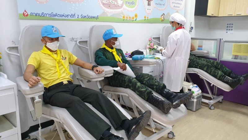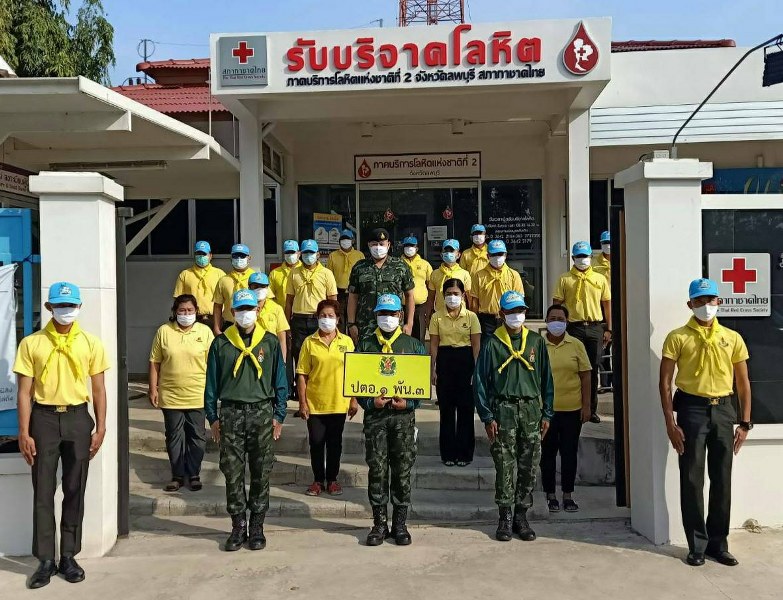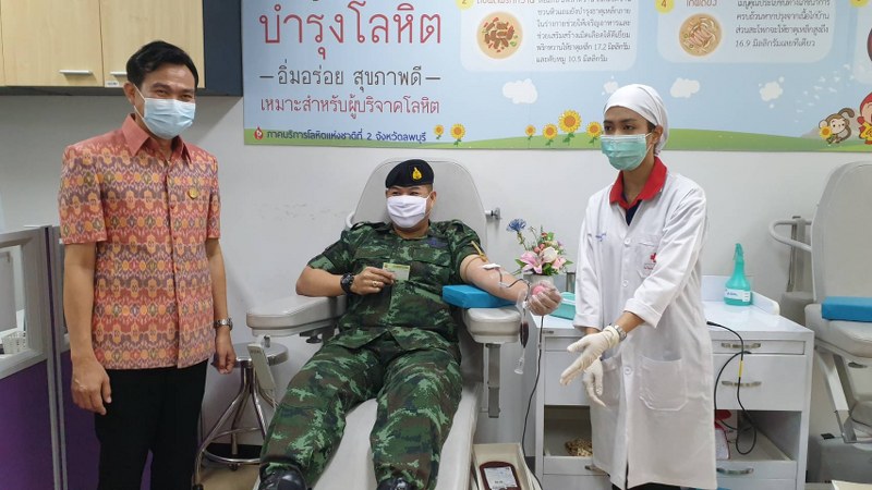 ที่ สำนักงานภาคบริการโลหิตแห่งชาติ ที่ 2 จังหวัดลพบุรี พันโท ยศวีร์ คงธนจารุอนันต์ ผู้บังคับกองพันทหารปืนใหญ่ต่อสู้อากาศยานที่ 3 กรมทหารปืนใหญ่ต่อสู้อากาศยาน ที่ 1 ค่ายภูมิพล จังหวัดลพบุรี ได้จัดกำลังพลจิตอาสา “เราทำความดี เพื่อชาติ ศาสน์ กษัตริย์” ตลอดจนสมาชิกสมาคมแม่บ้านทหารบก สาขา กองพันทหารปืนใหญ่ต่อสู้อากาศยานที่ 3 จำนวนกว่า 40 คน เดินทางโดยรถยนต์บัสโดยสารปรับอากาศของหน่วย เพื่อร่วมกันบริจาคโลหิต ตามโครงการ “รวมเลือดเนื้อ ชาติเชื้อไทย บริจาคโลหิตฝ้าวิกฤต COVID – 19 รอบ 2” เพื่อเป็นโลหิตสำรองให้กับโรงพยาบาลต่างๆ ในพื้นที่จังหวัดลพบุรี และจังหวัดใกล้เคียง ซึ่งอยู่ในภาวะขาดแคลน โลหิตไม่เพียงพอต่อการนำที่ใช่ในการช่วยเหลือ รักษาผู้ป่วย ในห้วงสถานการณ์การระบาด Covid – 19 ตามนโยบายของกองทัพบก