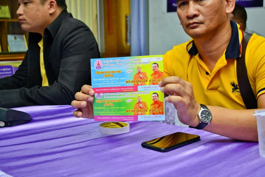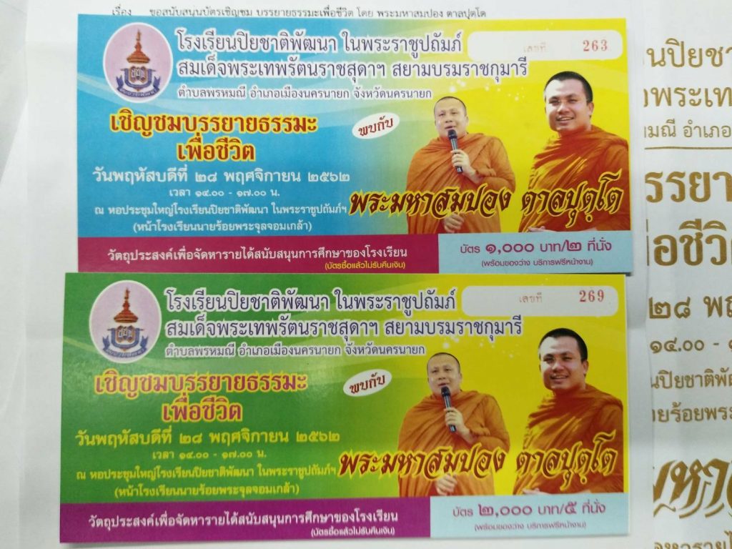 ในการจัดกิจกรรมในครั้งนี้ ได้เสนอขายบัตรชมบรรยายธรรมะล่วงหน้า โดยมีเจ้าหน้าที่ฝ่ายประชาสัมพันธ์ออกจำหน่ายบัตรในพื้นที่จังหวัดนครนายกและจังหวัดใกล้เคียง หากท่านพบเห็นสามารถให้การสนับสนุนได้ตามความสมัครใจ